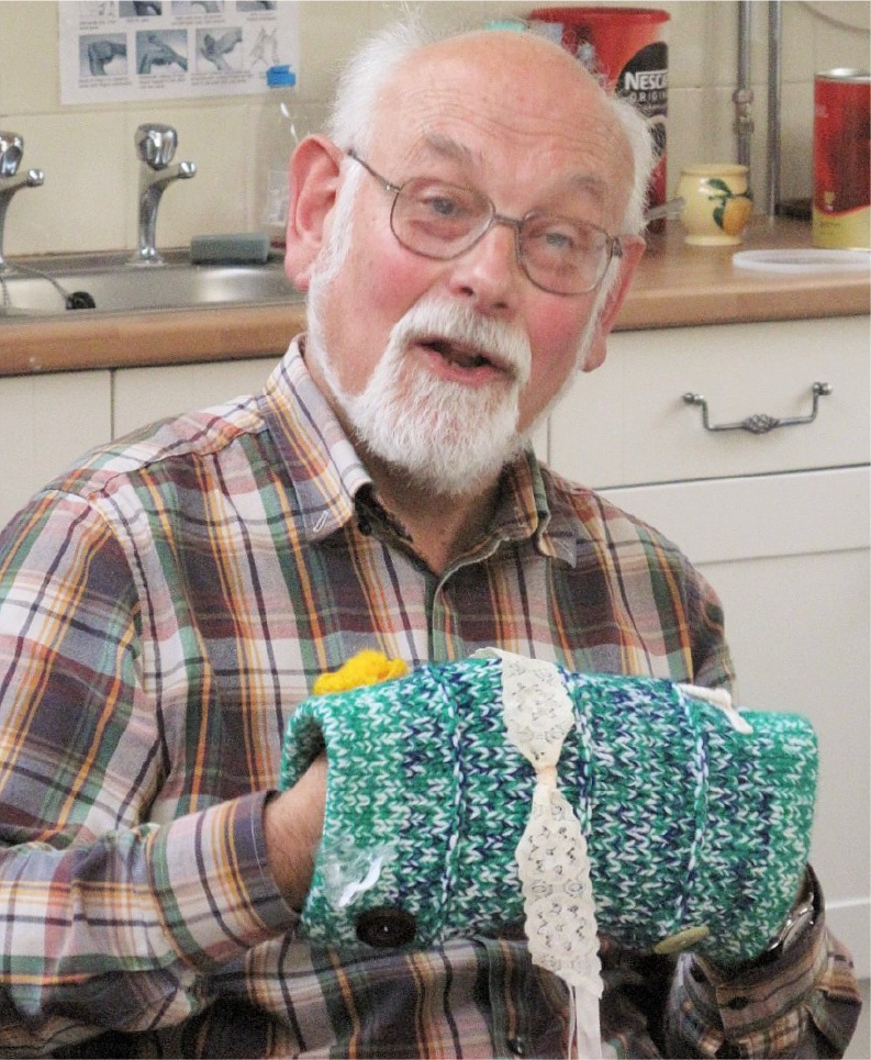 認知症マフ作りを続けている認知症サポートグループ「だんだん」(伊東裕子代表)のメンバーを講師に迎えて、2018年から2019年にかけて3回のワークショップを開催しました。だんだんのメンバーは日本の気候にあった素材選びや、裁縫や編み物が初めての人でも簡単に作れる方法など、実情にあった認知症マフを考案して20個を町内の高齢者施設を利用する人に届けました。
