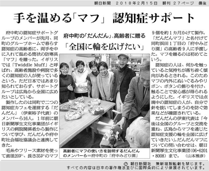 朝日新聞厚生文化事業団では「認知症マフ」の普及活動を行っています