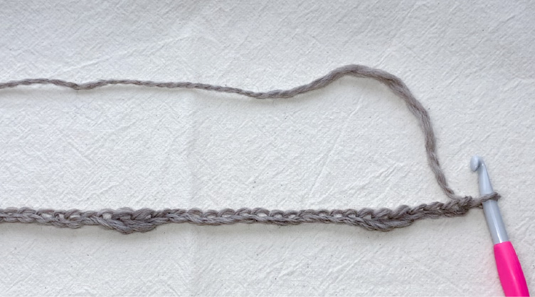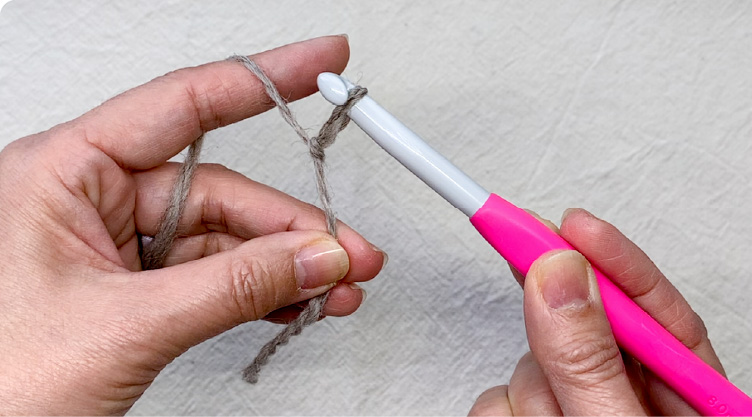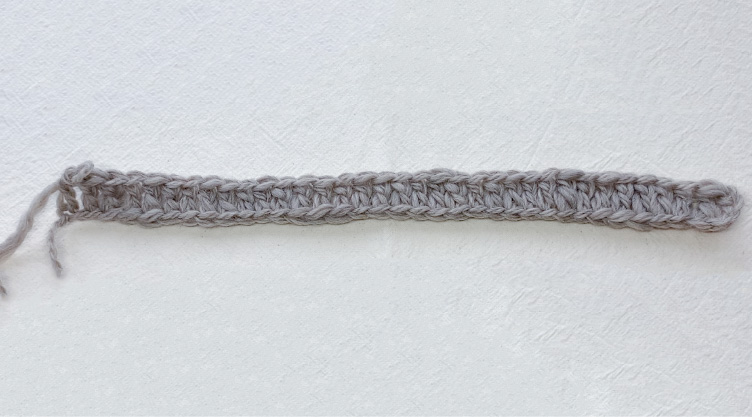 針を持たない方の指に糸をかけ、糸端を3~5cmほど残して記号図を参考に土台の鎖編みを編みます。