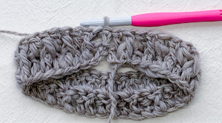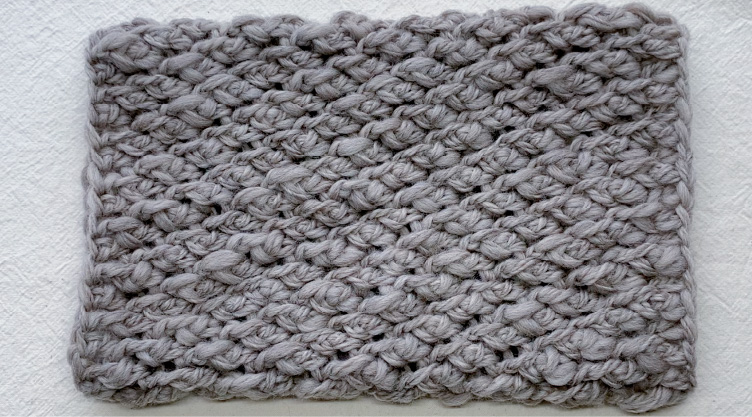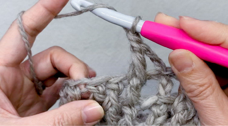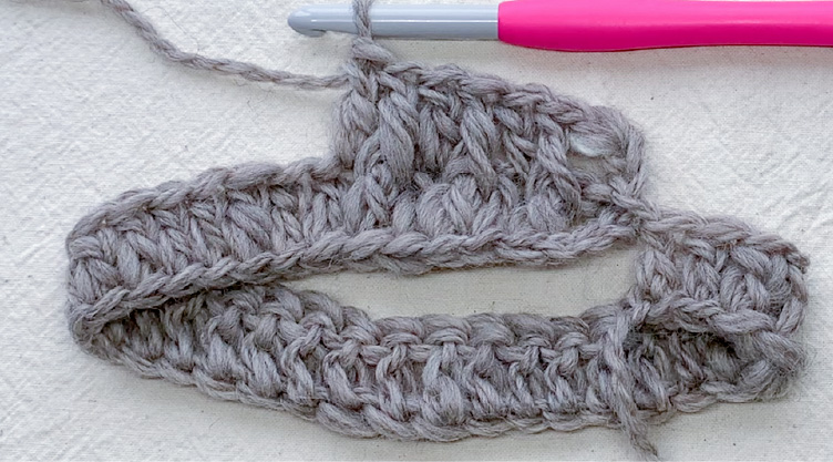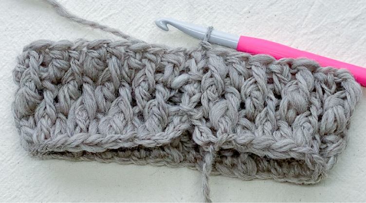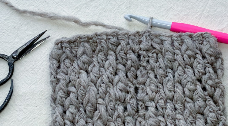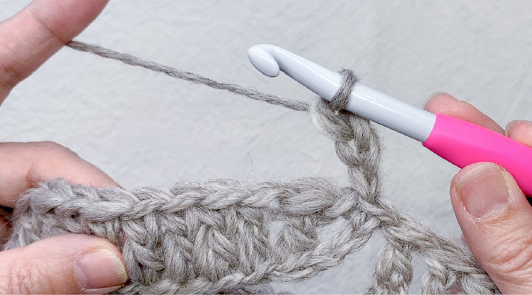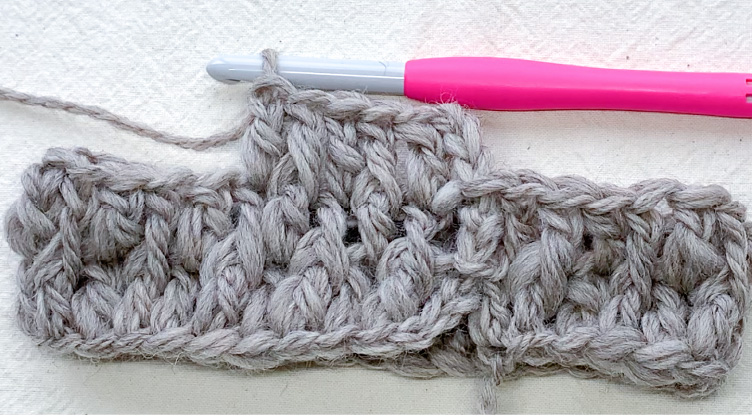 4段目以降も同様に、偶数段は表引き上げ編みから奇数段は長編みから交互に編んでいくと編み地に厚みが出ます。