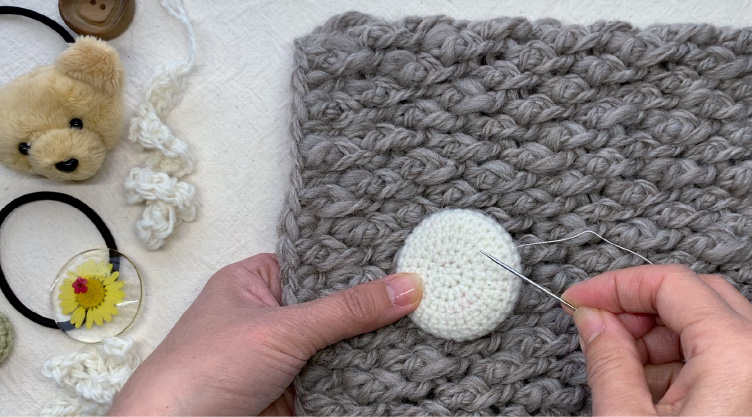 飾りをマフの内側と外側にしっかりと縫い付ける。